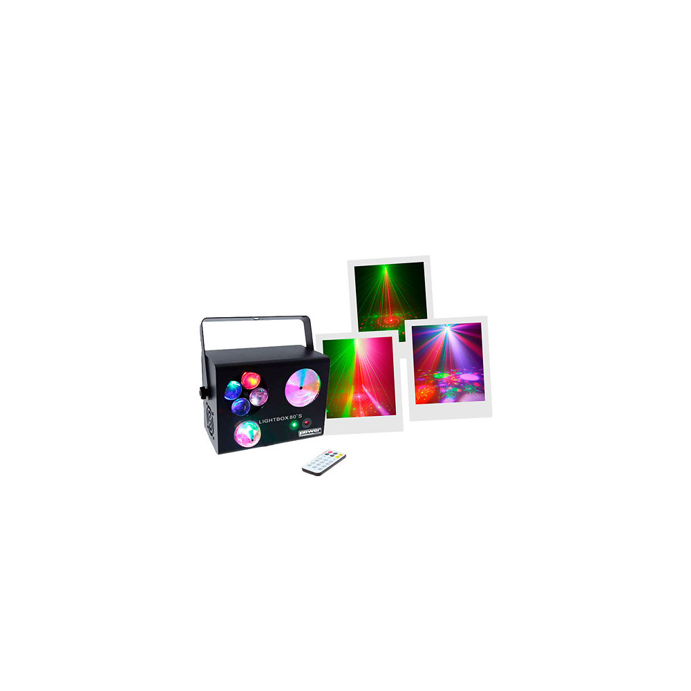 Le LIGHTBOX 80’S est un jeu de lumière multi-effets proposant quatre éclairages différents. Le plus novateur de la série LIGHTBOX grâce à ces effets originaux très novateurs il se compose d’un Sphero Magic Ball rotatif à 340° d’une puissance de 9W RGB 3in1, d’un nouvel effet Crypto d’une puissance totale de 12W à LED, d’un nouvel effet Strike de 9W et d’un effet laser multipoints de 80Mw en vert et rouge intégrant 16 motifs originaux. Lyre de suspension intégrée pour une installation simple rapide. Idéal bars, clubs, soirée, birthday party et autres.