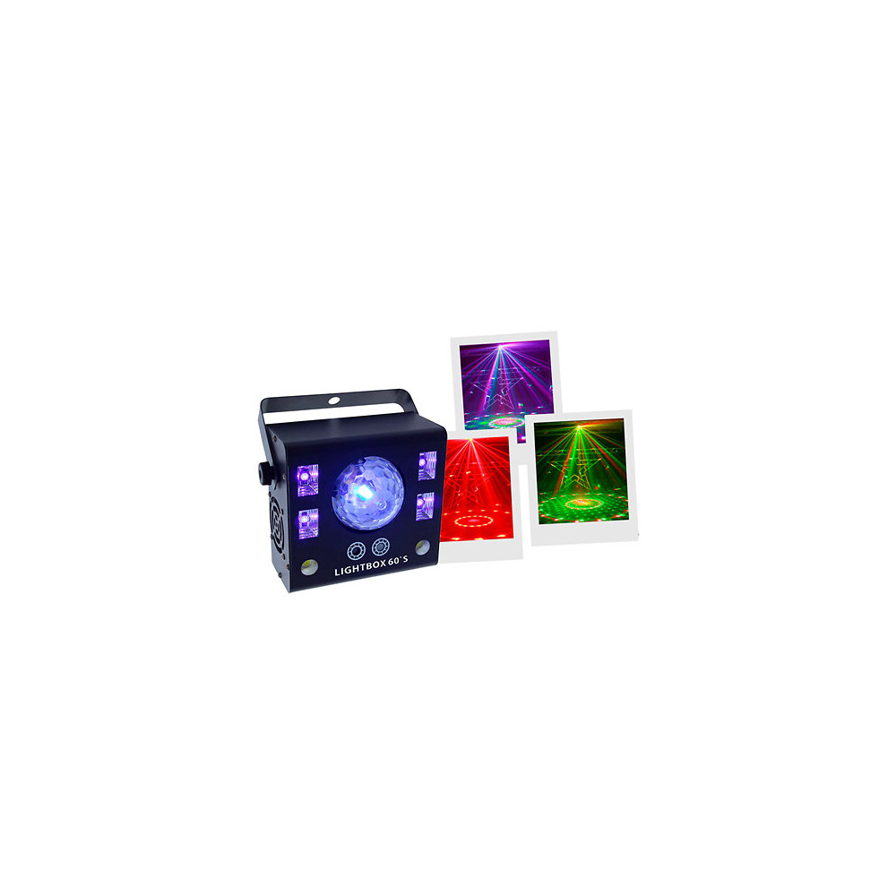 Le LIGHTBOX 60’S est un jeu de lumière multi-effets proposant quatre éclairages différents. Il est composé d’un Sphéro Magic Ball rotatif à 340° d’une puissance de 15W RGBW 4in1 (OSRAM LED), d’une lumière noire à Led d’une puissance de 12W totale, d’un stroboscope de 20W et d’un effet laser multipoints de 80Mw en vert et rouge. Lyre de suspension intégrée pour une installation simple rapide. Idéal bars, clubs, soirée, birthday party et autres lieux de loisirs.