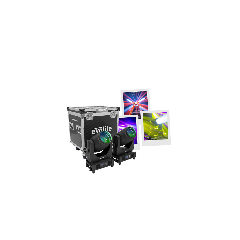 Paire de lyres Beam professionnelles, équipées d'un focus motorisé, d'une roue de 11 gobos, d'une roue de 14 couleurs, d'un prisme 8 facettes et d'un prisme triple rotatif 24 facettes.