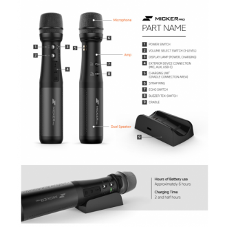 Le Micker est facile à utiliser. Pas besoin de temps de montage ou de préparation. Il vous suffit de l'allumer et de parler. La batterie et le haut-parleur sont intégrés dans la tige du micro sans fil. L'autonomie de la batterie est d'environ 6 heures. Pour le chargement, placez le Micker dans le chargeur fourni ou connectez-le par câble à un port USB. Le temps de charge est d'environ 2,5 heures.